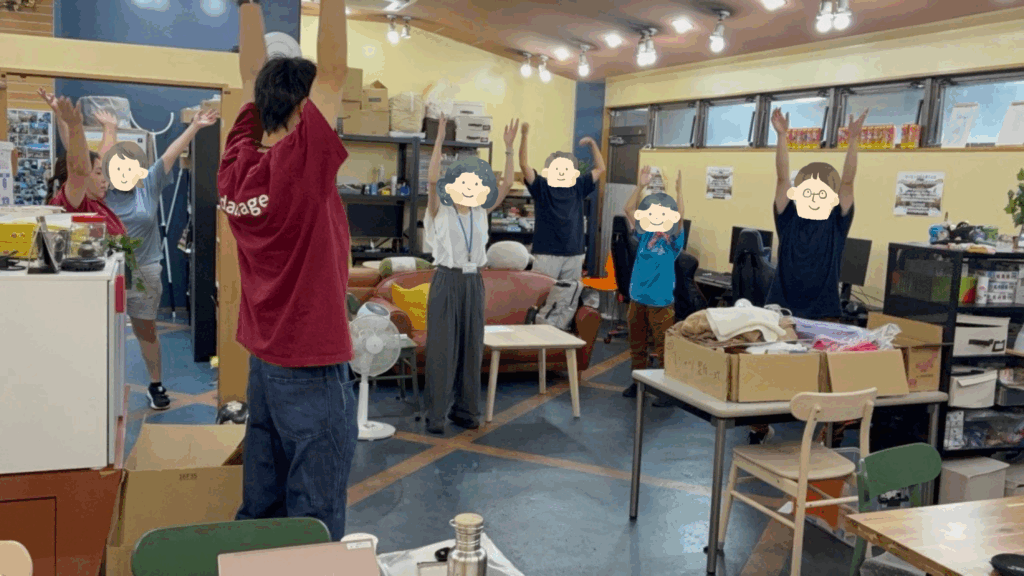 ジョブトレのフロアがある1階と、スタッフのいる2階に、朝イチでラジオ体操の音声が流れます。